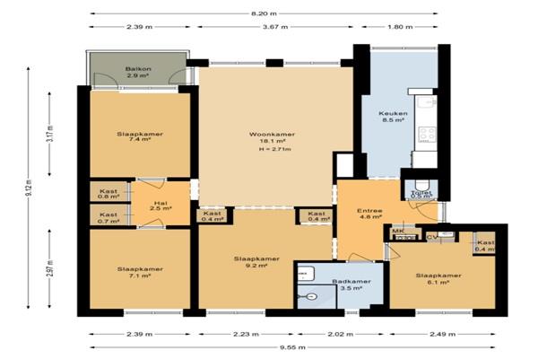 Er is een centrale hal met lift, brievenbussen, intercom en toegang tot de bergingen. Met de lift kom je op de galerij van de tweede etage. Je komt binnen in de hal met de meterkast en het toilet. De woonkamer geeft toegang tot het balkon welke op hetnoorden is gelegen. De aparte keuken is voorzien van inbouwapparatuur zoals een inductie kookplaat, vaatwasser, combi-magnetron, koelkast en een afzuigkap. Er zijn 4 slaapkamers waarvan een toegang gefet tot het balkon. De badkamer heeft een douche en een wastafel.