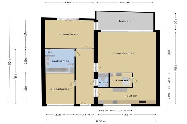 entree, toiletruimte met hangcloset en fonteintje, woonkamer met toegang naar het balkon en semi-open keuken. Het balcon is ruim en voorzien van een nieuw uitschuifbaar zonnescherm.