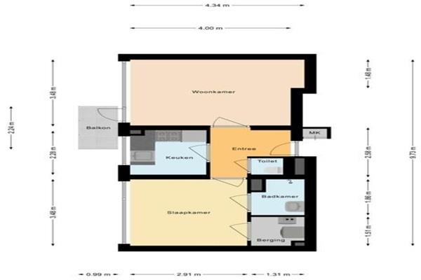 Entree; centrale hal met separate toiletruimte en vrije toegang tot de woonkamer, dichte keuken en slaapkamer. Aan de rechterzijde de woonkamer met veel lichtinval en deur naar zonnig balkon, in het midden een moderne dichte L-vormige keuken met inbouwapparatuur voorzien van gaskookplaat met afzuigkap, koelkast met vriesgedeelte, combimagnetron en een vaatwasser. De slaapkamer is aan de linkerzijde gesitueerd met deur naar de badkamer welke voorzien van wastafelmeubel, douchevoorziening en radiator. In de slaapkamer bevindt zich ook een vaste kast, te gebruiken als bergruimte en tevens voorzien van een aansluiting voor wasmachine en droger.