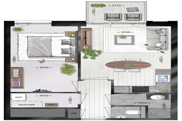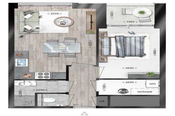 Je komt binnen in de hal met toegang tot de technische ruimte wat tevens ook als inpandige berging dient.. De woonkamer is voorzien van een moderne keuken die beschikt over inbouwapparatuur, waaronder een inductie kookplaat, combi oven/magnetron, afzuigkap, vries/koelcombinatie en vaatwasmachine. Dit appartement beschikt over een aparte slaapkamer.