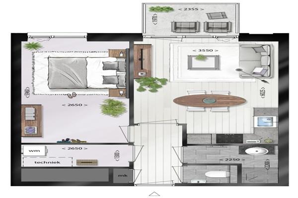 Je komt binnen in de hal met toegang tot de technische ruimte wat tevens ook als inpandige berging dient. De woonkamer is voorzien van een moderne keuken die beschikt over inbouwapparatuur, waaronder een inductie kookplaat, combi oven/magnetron, afzuigkap, vries/koelcombinatie en vaatwasmachine. Dit appartement beschikt over een aparte slaapkamer.