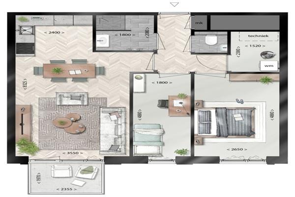 Je komt binnen in de hal met toegang tot de technische ruimte wat tevens ook als inpandige berging dient.. De woonkamer is voorzien van een moderne keuken die beschikt over inbouwapparatuur, waaronder een inductie kookplaat, combi oven/magnetron, afzuigkap, vries/koelcombinatie en vaatwasmachine. Dit appartement beschikt over twee aparte slaapkamers.