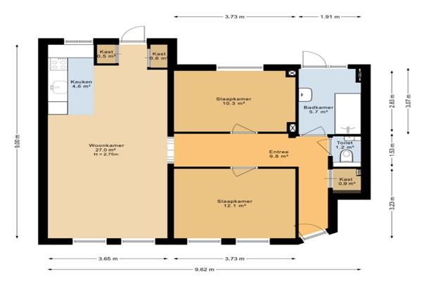 Entree met eigen voordeur. Binnekomst in de hal met een ruime bergkast, het aparte toilet met fonteintje. Via de hal heb je toegang tot alle ruimtes. De woonkamer met open keuken geeft toegang tot de tuin. De keuken is voorzien van een koel-vries combi, vaatwasser oven, inductie kookplaat en een afzuigkap. Een slaapkamer ligt aan de straatkant en de ander aan de tuinkant. De badkamer heeft een ligbad met douche en een wastafel en handdoekradiator. Woning is zeer geschikt om te delen.