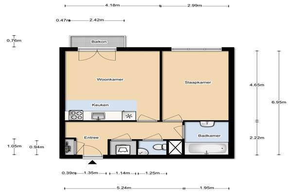 Woonkamer met open keuken en toegang tot het balkon. Het balkon is 2m2 groot en georiënteerd op het Zuid/Westen. Keukenblok is voorzien van koelkast, vriezer, vaatwasser, combi oven/magnetron en elektrische kookplaat.