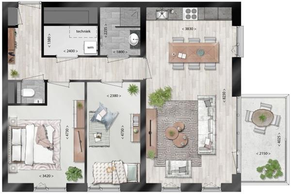 Je komt binnen in de hal met toegang tot de technische ruimte wat tevens ook als inpandige berging dient. De woonkamer is voorzien van een moderne keuken die beschikt over inbouwapparatuur, waaronder een inductie kookplaat, combi oven/magnetron, afzuigkap, vries/koelcombinatie en vaatwasmachine.
