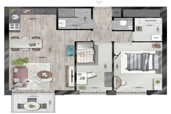 Je komt binnen in de hal met toegang tot de technische ruimte wat tevens ook als inpandige berging dient. De woonkamer is voorzien van een moderne keuken die beschikt over inbouwapparatuur, waaronder een inductie kookplaat, combi oven/magnetron, afzuigkap, vries/koelcombinatie en vaatwasmachine.