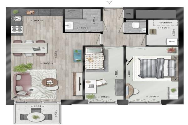 Je komt binnen in de hal met toegang tot de technische ruimte wat tevens ook als inpandige berging dient. De woonkamer is voorzien van een moderne keuken die beschikt over inbouwapparatuur, waaronder een inductie kookplaat, combi oven/magnetron, afzuigkap, vries/koelcombinatie en vaatwasmachine.
