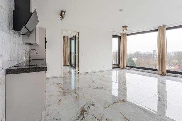 Bij binnenkomst op de zevende verdieping betreed je een hal met toegang tot een separaat toilet, een wasruimte en een ruime berging. Dubbele openslaande deuren geven toegang tot de grote woonkamer met moderne open keuken en het aangrenzende balkon van circa 10 m².