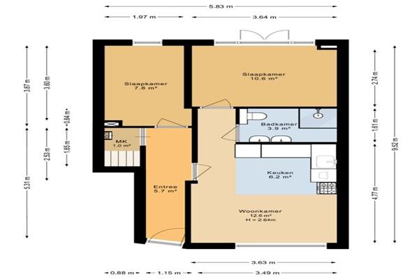 Je komt binnen via de hal die toegang tot alle andere ruimtes. De open keuken is voorzien van een vaatwasser, gas kookplaat, afzuigkap, combimagnetron en koel-vries combinatie. Aan de achterzijde zijn twee slaapkamers welke ook toegang hebben tot het de tuin, welke gelegen is op het zuiden. Een slaapkamer is ongeveer10.6m2 en de tweede is ongeveer 7.8m2. De badkamer is voorzien van een dubbele wastafel, toilet. douche en handdoekradiator.