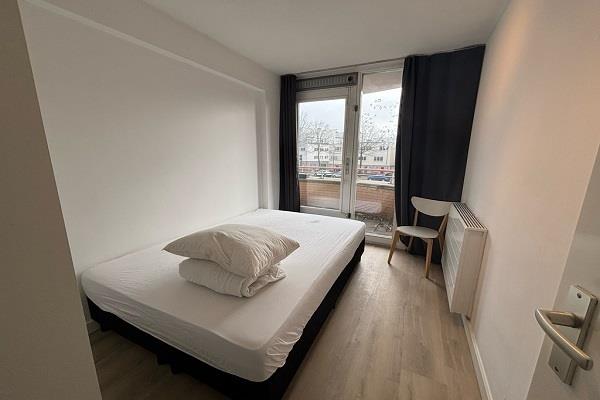 De ruime badkamer is voorzien van bad, wastafel met meubel en een wasmachine. Grote slaapkamer bevindt zich aan de voorzijde van het appartement en is voorzien van kast en bed. De meer compacte slaapkamer is eveneens ingericht met een bed en kast en geeft daarnaast toegang tot het balkon, net als de woonkamer.