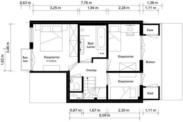 De derde kamer (ca. 2,0 x 2,35 m) is een fijne studeer- of kinderkamer. De 2e en 3e (slaap)kamer hebben toegang tot het balkon op het zuiden op de 2e etage. Op dit balkon zijn twee grote kasten gemaakt die samen circa 4 m3 aan bergruimte bieden.