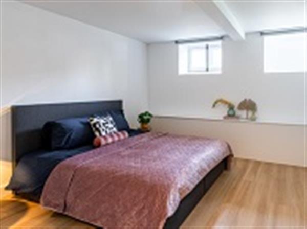 De badkamer is voorzien van een douche, wastafel en toilet. In de kelder van het appartement bevindt zich de slaapkamer met een tweepersoonsbed en een kledingkast.