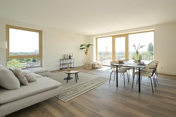 De woonkamer biedt toegang tot een zonnig balkon op het zuiden, waar je heerlijk buiten kunt zitten en genieten van de zon.