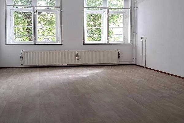 De woonkamer van ongeveer 15 m² staat in open verbinding met de keuken en biedt een prettige leefruimte.