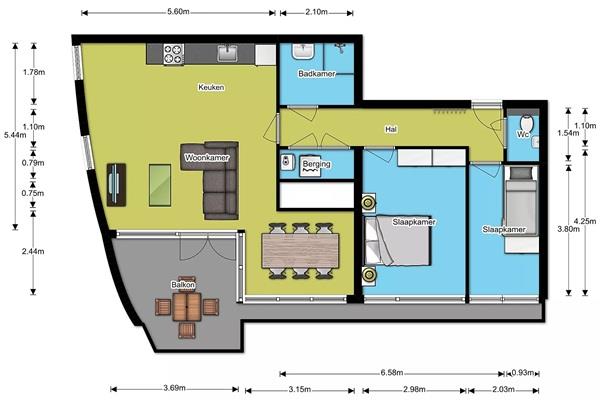 Het appartement heeft twee slaapkamers, waarvan de tweede kamer ook ideaal is als werk- of inloopkastkamer. De badkamer is comfortabel ingericht met een inloopdouche en wastafel. Daarnaast is er een apart toilet en een inpandige berging met extra opbergruimte.