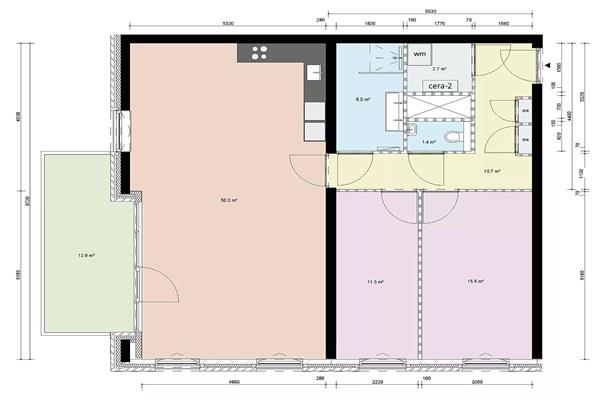 Je komt binnen in de hal, vanwaar je alle kamers bereikt. De woonkamer is licht en ruim, met genoeg plek voor een zit- en eethoek. De keuken is eenvoudig maar functioneel ingericht. Verder zijn er twee slaapkamers (zie plattegrond) en een badkamer met de basisvoorzieningen.
