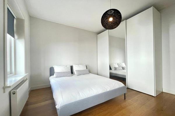 De lichte slaapkamer heeft een tweepersoonsbed en ruime kasten, daarnaast is er voldoende plek om een thuiswerk plek te creëren