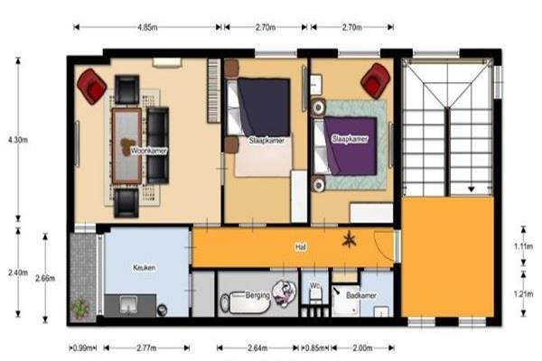 Hal, gesloten keuken, separaat toilet, badkamer met douche en wastafel, 2 slaapkamers