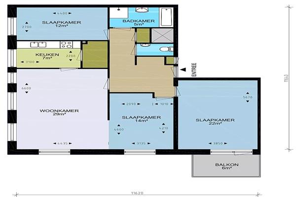 4-kamer appartement met een oppervlakte van 108 m². De lichte woonkamer van circa 20 m² vormt het hart van de woning en biedt toegang tot het eerste balkon – ideaal voor een in de ochtend of een frisse avondbries. De open keuken is uitgerust met een inductiekookplaat, koel-vriescombinatie, elektrische oven, spoelbak en afzuigkap. Vanuit de hal bereik je de drie slaapkamers, waarvan de grootste directe toegang heeft tot het tweede balkon. De badkamer is modern ingericht met een inloopdouche, ligbad en wastafel. Het toilet bevindt zich in een aparte ruimte. Praktisch is ook de inpandige berging met aansluiting voor een wasmachine en/of droger – handig én uit het zicht.