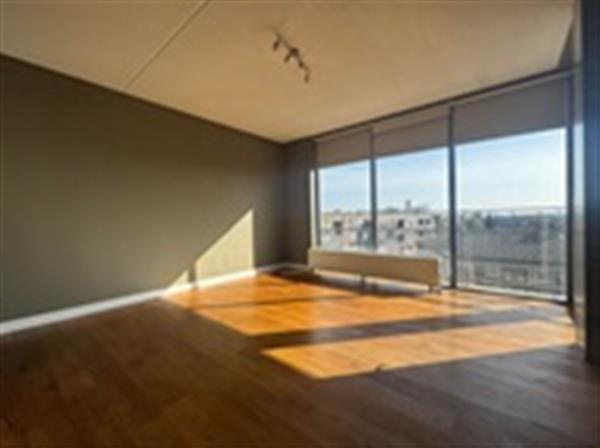 Hal/entree met meterkast, toilet met fonteintje en berging met C.V.-ketel en aansluiting voor wasmachine en droger. Lichte woonkamer met deur naar het balkon. Vanuit de woonkamer en het balkon kijk je mooi uit richting de binnenstad.