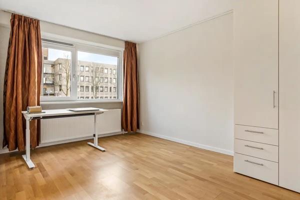 Entree, hal, meterkast, toilet en toegang tot de woon/eetkamer en open keuken. De keuken is voorzien van vaatwasser, combi-magnetronoven en 4-pits kookplaat. Het balkon, grenzend aan de woonkamer, vangt de ochtend- en middagzon. Er zijn twee slaapkamers, de ene met een grote kast op maat en een kleinere slaapkamer.