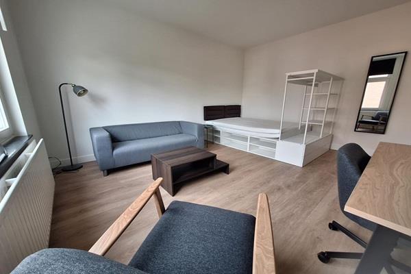 Het appartement ligt rustig aan de achterzijde van het gebouw op de eerste etage. Bij binnenkomst stap je in een hal die direct toegang biedt tot de moderne badkamer, voorzien van een douche en toilet. Daarnaast bevindt zich hier de wasmachine. De luxe keuken is volledig uitgerust met alles wat je nodig hebt: een inductiekookplaat, koelkast, diepvries, vaatwasser en afzuigkap. Via de keuken kom je in de sfeervolle woon-/slaapkamer. Dankzij de grote ramen geniet je hier van veel natuurlijk licht en een prettig ruimtelijk gevoel. De kamer is volledig gemeubileerd met onder andere een comfortabel bed, een gezellige bank, eettafel en bureau. Alles wat je nodig hebt om meteen zorgeloos te wonen.