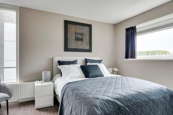 De ruime slaapkamer met luxe tweepersoons boxspring, ruime kledingkast en een strakke wand- en plafondafwerking en een ruimte voor een werkplek. De slaapkamer met hoge raampartij zorgt voor veel lichtinval in deze ruimte.
