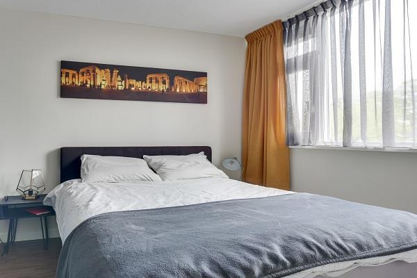 De ruime slaapkamer met luxe tweepersoons boxspring, ruime kledingkast en een strakke wand- en plafondafwerking.