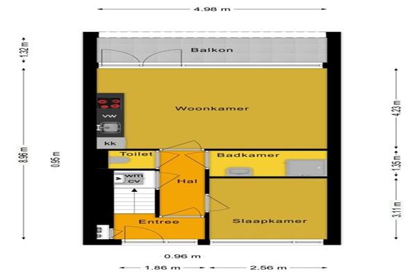 Vanuit uw eigen voordeur treedt u de hal binnen welke toegang geeft tot de woonkamer, de slaapkamer, badkamer en aparte ruimte voorzien van de wasmachine. Vanuit de hal hebt u ook toegang tot de deels betegelde toiletruimte met zwevend closet. Het gehele appartement is voorzien van luxe donker houten pvc-vloer.