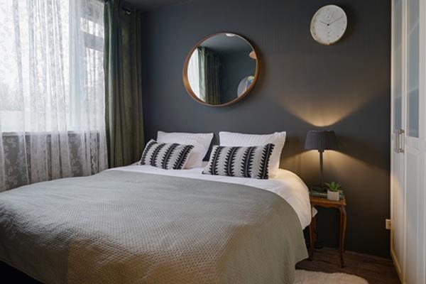 De ruime slaapkamer met luxe tweepersoons boxspring, ruime kledingkast en een strakke wand- en plafondafwerking.