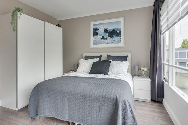 De ruime slaapkamer met luxe tweepersoons boxspring, ruime kledingkast en een strakke wand- en plafondafwerking en een ruimte voor een werkplek. De slaapkamer met hoge raampartij zorgt voor veel lichtinval in deze ruimte.
