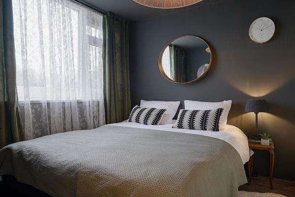 De slaapkamer met hoge raampartij zorgt voor veel lichtinval in deze ruimte.