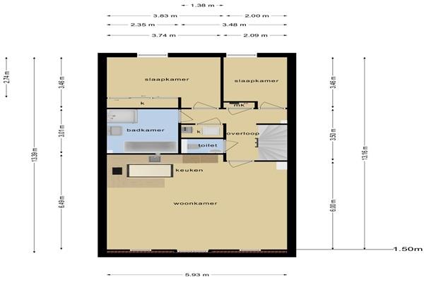 Op het sanitair na is de gehele verdieping voorzien van een nette PVC-vloer, zo ook de living. Hier kom je als eerste uit naast de open keuken, waar je te midden van een luxe, stenen U-vormig aanrecht van alle gemakken bent voorzien. Zo heb je de beschikking over een 5-pits gasfornuis met wokbrander, een afzuigkap met RVS achterwand, een inbouwoven en een inbouwmagnetron, vaatwasser en een koel/vriescombinatie.