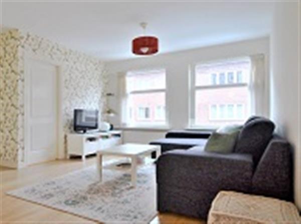 Gezamenlijk trappenhuis, entree op de tweede verdieping. De lichte woonkamer met open keuken is gelegen aan de achterzijde en geeft direct toegang tot het zonnige balkon op het zuiden.
