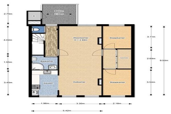 Portiek met trap naar de 1e verdieping; Entree woning: Hal met trap naar de 2e verdieping: Overloop met toilet met hangend closet en fontein, vanaf de overloop toegang tot het terras (gelegen op het noordwesten); Badkamer met inloopdouche met thermostaatkraan, wastafel, design radiator en wasmachine aansluiting; Lichte woon-/eetkamer met half open keuken met modern keukenblok met natuurstenen aanrechtblad, koelkast met vriesvak, combi-oven, 5 pits gaskookplaat, rvs afzuigkap en vaatwasser; Vanuit de woonkamer toegang tot de tussenhal met kast met opstelplaats c.v.-combiketel, slaapkamer 1 aan de voorzijde, slaapkamer 2 aan de achterzijde.