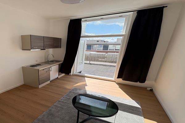 •Woonkamer met open keuken en deur naar het zonnige dakterras.