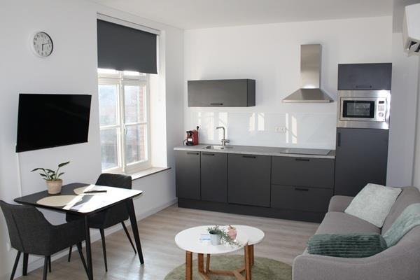Woonkamer met open keuken totaal (3.28 x 5.75). De keuken is voorzien van een moderne keuken met apparatuur (koelkast met vriesvak, vaatwasser, oven, koelkast, afzuigkap, inductie kookplaat).