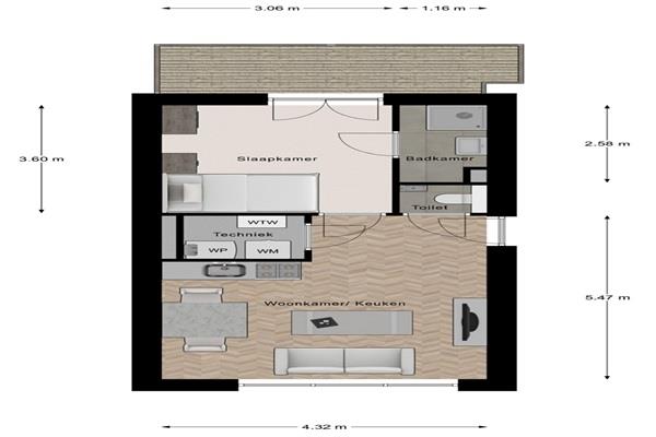 Bij binnenkomst vanuit de gemeenschappelijke ruimte betreed je de lichte woonkamer met open keuken. Deze leefruimte biedt alle comfort voor dagelijks wonen en is uitgerust met een keukenopstelling voorzien van een inductiekookplaat, koelkast, afzuigkap. Voor een oven/magnetron is een aansluitpunt aanwezig.