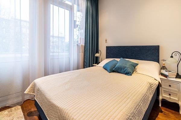 Het appartement bevindt zich op de 1e verdieping (gemakkelijk bereikbaar via de trap) en beschikt over twee balkons, één aan de voorzijde en één met uitzicht op de gemeenschappelijke tuin aan de achterzijde van het gebouw. De gezellige en lichte woonkamer is voorzien van veel ramen en modern meubilair. De gerenoveerde keuken biedt toegang tot het balkon. De hoofdslaapkamer met een grote kledingkast bevindt zich aan de achterzijde van het gebouw en heeft een groot raam met uitzicht op de rustige, groene tuin en eveneens toegang tot het balkon. De tweede slaapkamer bevindt zich aan de andere kant van de gang, aan de voorzijde van het gebouw, en heeft ook toegang tot het balkon.
