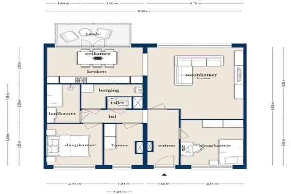 Algemene entree op de begane grond of binnenkomst via parkeergarage. Lift naar de woning op de tweede etage. Hal met toegang tot alle vertrekken. Aan de achterzijde van de woning is de ruime woonkamer met open keuken en openslaande deuren naar het zonnige balkon gelegen op het westen (inclusief zonwering). De keuken is voorzien van een koel-/vriescombinatie, 4-pitsgaskookplaat, vaatwasser, oven en afzuigkap. Aan de entreezijde van het appartement bevinden zich drie ruime slaapkamers, waarvan twee voorzien van praktische inbouwkasten. Badkamer met ligbad, inloopdouche en wastafelmeubel. Inpandige bergruimte met wasmachine (inclusief) en legplanken. Separaat toilet met fonteintje.