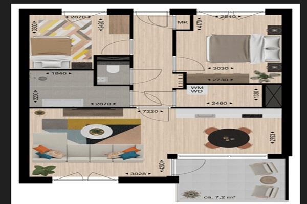 Het appartement biedt een hoog wooncomfort dankzij de kwalitatieve afwerking. Er zijn twee ruime slaapkamers, een stijlvolle woonkamer en een moderne open keuken van Novitelli, uitgerust met inbouwapparatuur van Whirlpool. De badkamer is voorzien van sanitair van Villeroy & Boch en er is een separaat toilet voor extra gemak. Daarnaast beschikt het appartement over een aparte berging met aansluitingen voor een wasmachine en droger.