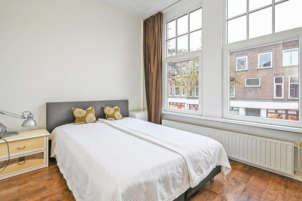 Open portiek, u neemt de trap naar de eerste etage, waar de voordeur van het appartement zich bevindt. Binnenkomt in de hal, die alle vertrekken op een centrale wijze verbindt. De lichte en ruime woonkamer is af te scheiden door een charmante en-suite met glas-in-looddeuren, waardoor er een gezellige en karakteristieke sfeer ontstaat. Grote raampartijen zorgen voor veel daglicht en een prettige ambiance.