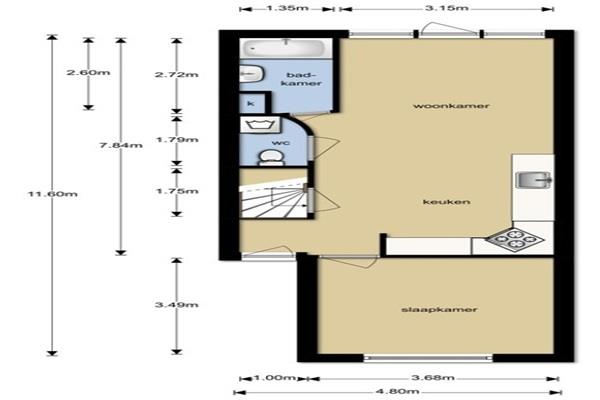 Entree, hal met toilet. Trap naar souterrain welke als ruime (18m2) slaapkamer dient.