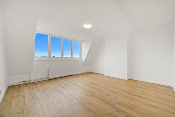 Gemeenschappelijk entree op straatniveau, trap naar derde verdieping, entree woning, gang, woonkamer aan de voorzijde met o.a. daklichten en moderne open keuken met inbouwapparatuur waaronder een oven, inductiekookplaat, koel-/vriescombinatie en vaatwasser, vanuit de gang toegang tot de ruime badkamer met ligbad, inloopdouche en dubbele wastafel met meubel, zeer grote slaapkamer aan de achterzijde en een kleinere naastgelegen slaapkamer, apart toilet bereikbaar vanaf de gang.