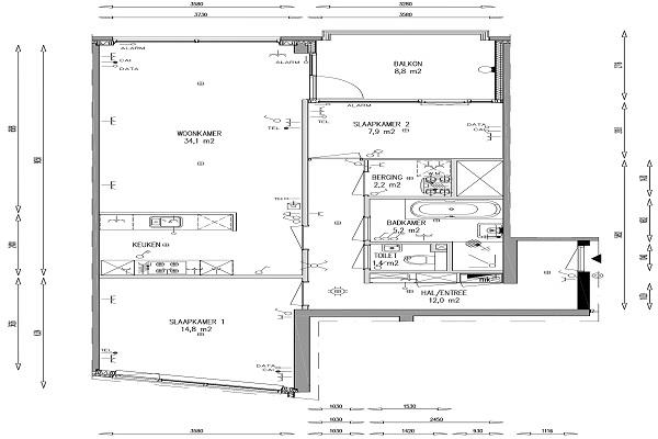 Het appartement heeft een woonkamer met open keuken. Vanuit de woonkamer en de kleine slaapkamer is het balkon bereikbaar. De keuken is voorzien van een inductiekookplaat met afzuigkap, vaatwasser, koelkast en een combi-magnetron. De badkamer heeft een inloopdouche, ligbad en wastafel. Het toilet is separaat gelegen. De slaapkamers zijn 15 en 8 m2. In de inpandige berging vind je de aansluiting voor de wasmachine en de WKO-installatie.
