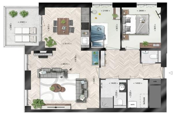 Het appartement heeft 2 slaapkamers en een eigen privé buitenruimte met een oppervlakte van 8m2.