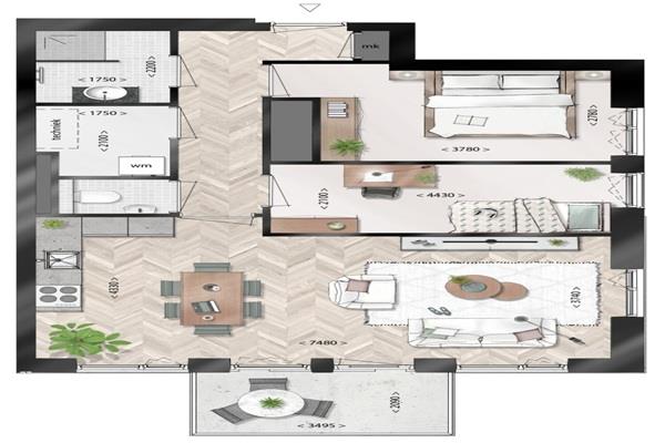 Het appartement heeft 2 slaapkamers en een eigen privé buitenruimte met een oppervlakte van 7m2.