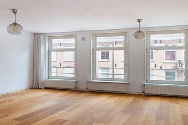 De open woonkamer bevindt zich aan de voorzijde van het appartement. Er zijn drie grote ramen die veel natuurlijk licht binnenlaten.