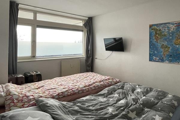 Ruime woonkamer met toegang tot het balkon en opendoorgang naar de grote slaapkamer.