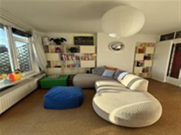 Woonkamer: Een lichte leefruimte voorzien van grote raampartijen die zorgen voor veel daglichtinval. De inrichting is modern en kleurrijk, met een comfortabele zithoek en unieke designelementen.